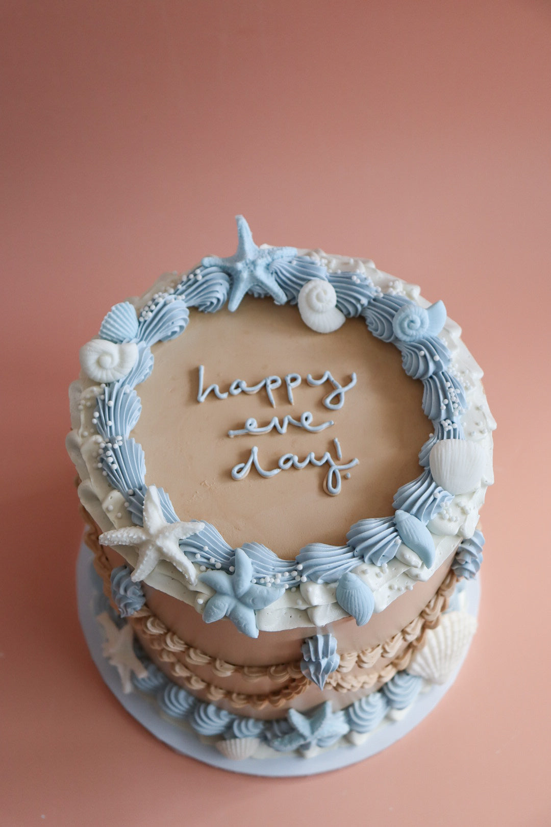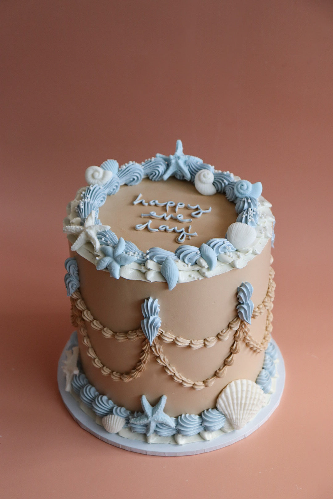 Dive into your dreamy beachy cake with this chic vintage-inspired cake, Seashell Sandy. Adorned with delicate seashells, vintage piping and a customisable message. Fun!